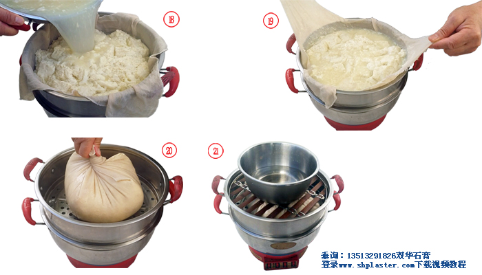步驟12: 激烈攪拌煮開的豆?jié){,與此同時把石膏漿倒入豆?jié){中,此時豆?jié){的溫度大約在96℃左右。(溫馨提示:豆?jié){溫度越高,所用的食品級點石膏粉的數(shù)量越少,反之則食品級點石膏粉用量越多。如果豆?jié){溫度降到85℃時,食品級點豆腐石膏粉的用量要增加到每100克干黃豆,4克食品級點豆腐石膏粉。)